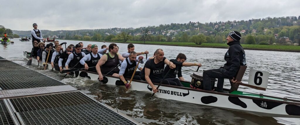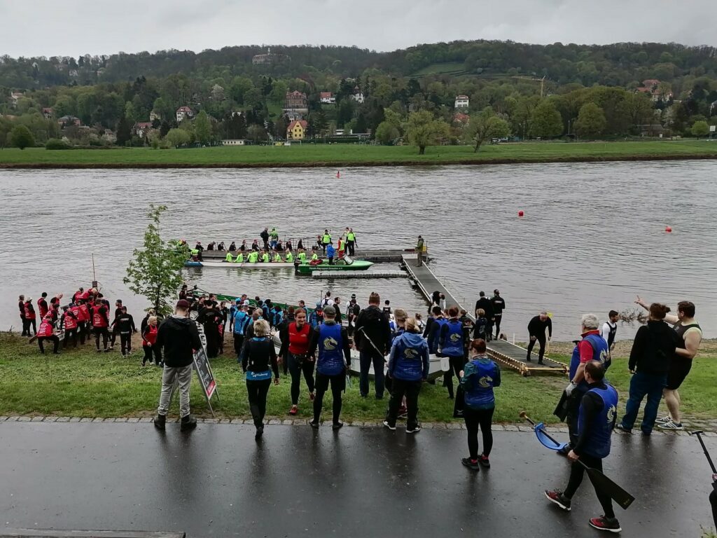 Viel geändert haben wir am alt bewerten Modell nicht. Am Vormittag steht ganz klar der Sport im Vordergrund. Die 10 km entlang der Dresdner Elbschlösser wurden mit zwei Wenden gefahren und als offene sächsische Langstreckenmeisterschaft ausgetragen. Trotz des 30 Sekunden Zeitversatzes beim Start, kam es auf der Strecke zu spannenden Zweikämpfen und Überholvorgängen. Den Titel konnte sich am Ende „Betreutes Paddeln Frosch Cotta“ mit einer Zeit von 50 min und 20 Sekunden sichern. Wir haben uns hinter dem „Dragons Club Leipzig“ den 3. Platz erkämpft.