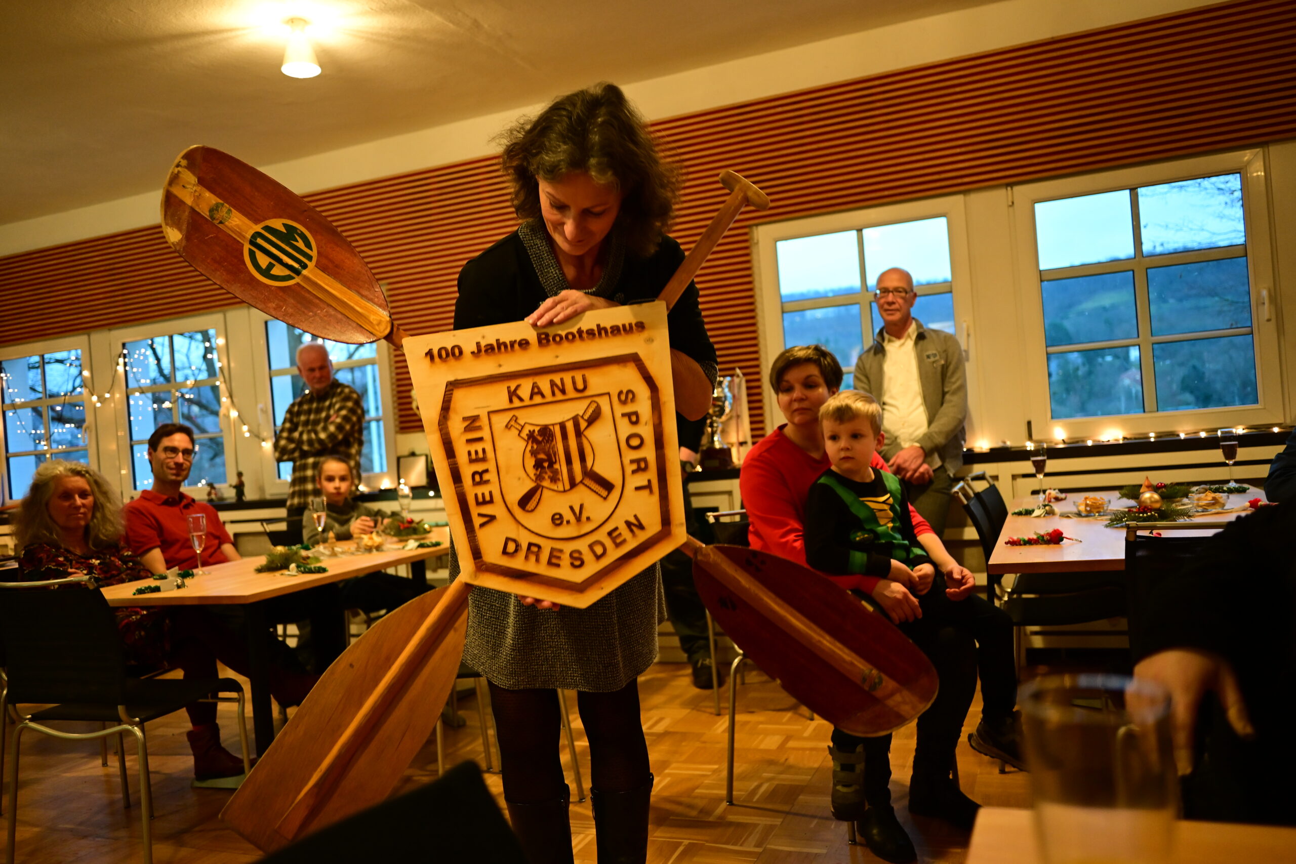 Ein ganz besonderes Zeichen des Jubiläums setzte unser Sportfreund Mathias Henke: Aus alten Paddeln und Holz schuf er ein Erinnerungsemblem zum 100-jährigen Bootshausjubiläum. Dieses in Handarbeit gefertigte Stück verbindet Vergangenheit und Gegenwart unseres Vereins und wird künftig einen festen Platz im Bootshaus haben – als sichtbares Zeichen unserer Geschichte.