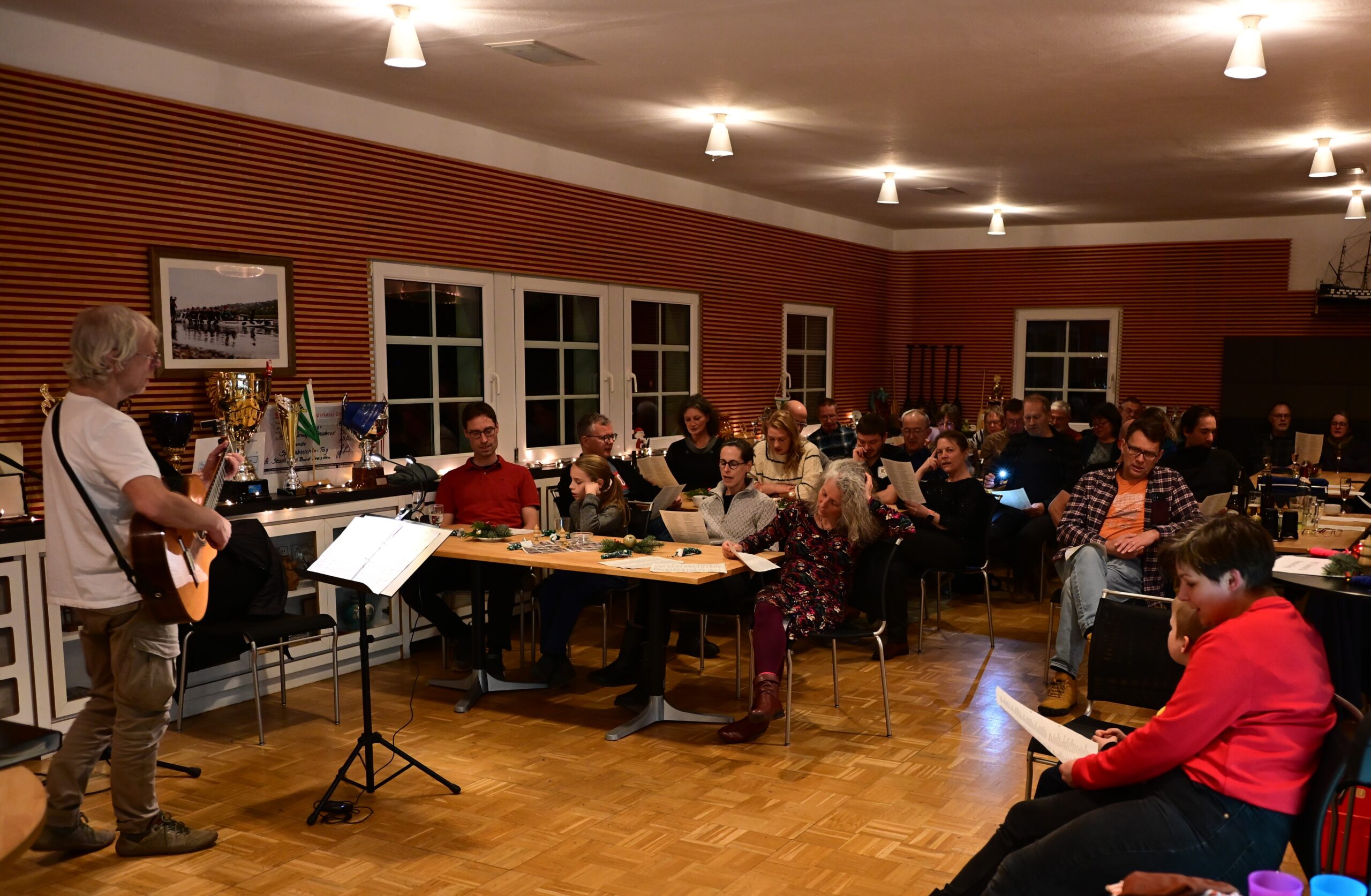 Gemeinsam stießen wir auf das Jubiläum an, zu dem auch benachbarte Sportvereine ihre Glückwünsche durch entsandte Vertreter überbrachten. Im Anschluss sorgte Andreas Zöllner, bekannt durch seine langjährige Mitgliedschaft in der Band Das Blaue Einhorn, mit eigenen Liedern, Chansons sowie Stücken von Rio Reiser und Gerhard Gundermann für einen musikalischen Höhepunkt. Beim gemeinsamen Singen von Weihnachtsliedern – ausgestattet mit Textblättern – wuchs die Runde schließlich zu einem kleinen Chor zusammen, der selbst die größten Gesangsmuffel mitriss.