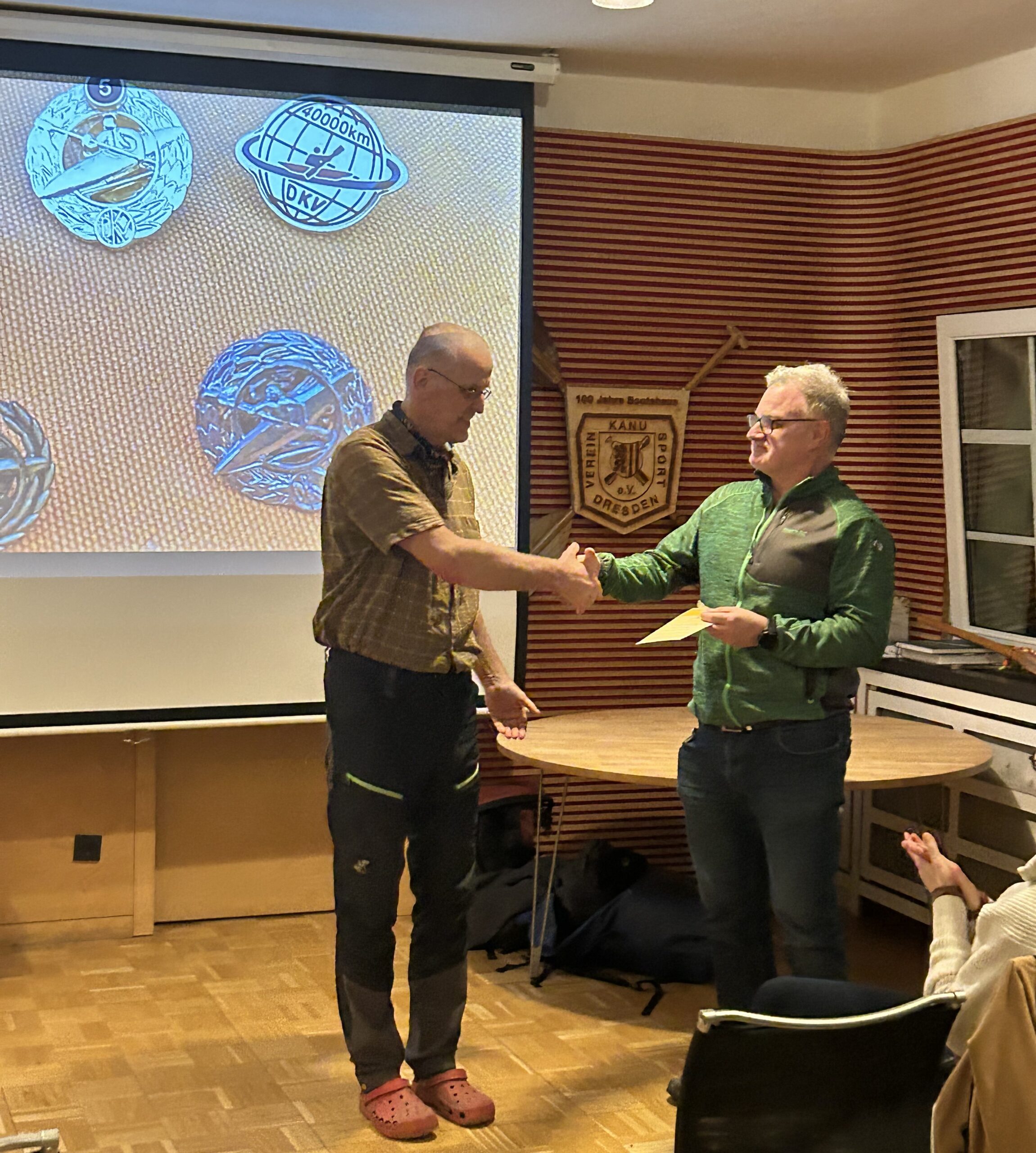 Ein spannender, inspirierender Abend, der ganz sicher jede Menge Fernweh geweckt hat. Am Schluss überreichte Falk Bruder, als Beauftragter für Wandersportwettbewerbe beim Sächsischen Kanuverband, unserem Vereinsmitglied Winfred Röttger das Wasserwanderabzeichen in Silber.